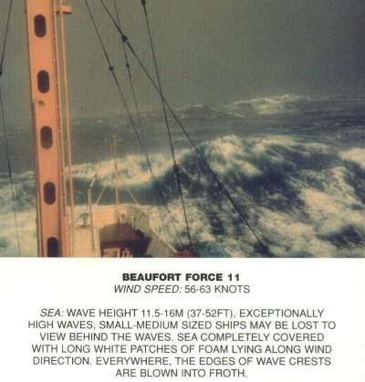 10 | Θύελλα (Storm) | Πολύ τρικυμιώδης | Σπάνια παρατηρείται στο εσωτερικό της ξηράς. Δέντρα σπάζουν ή ξεριζώνονται. Πολλά κεραμίδια αποσπώνται από τις σκεπές, αρκετές ζημιές στο εξωτερικό των κτιρίων. | Πολύ ψηλά (8 - 12,5 μ.) κύματα με μακριές λοφώδεις ράχες. Το σπάσιμο και κύλισμα των κορυφών των κυμάτων γίνεται έντονο και βίαιο. Η θάλασσα εμφανίζει μεγάλα λευκά μπαλώματα και η συνολική της εμφάνιση αρχίζει να ασπρίζει. Η ορατότητα μειώνεται. |