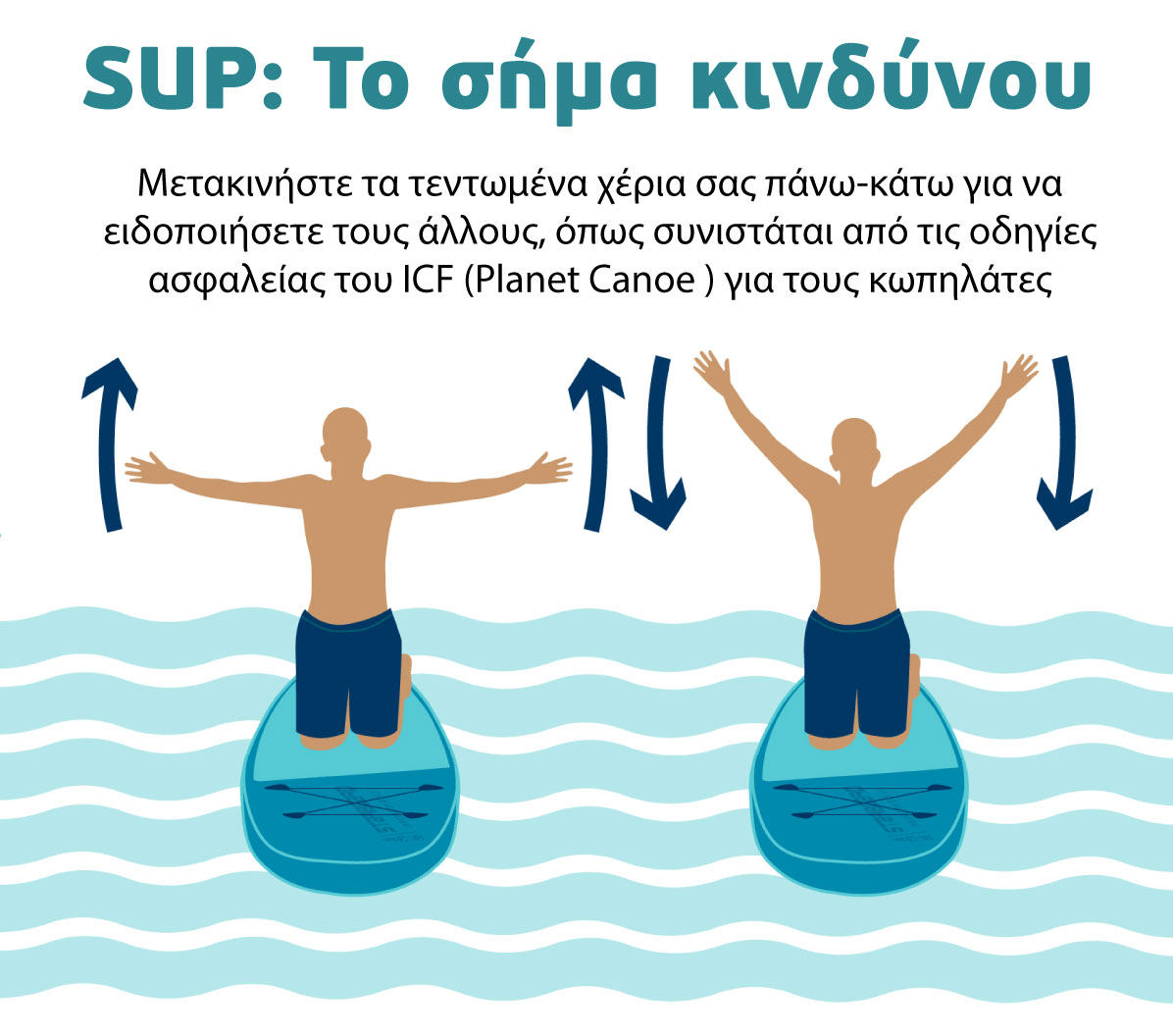 @Μπορεί να προκύψουν απρόβλεπτες περιστάσεις όταν βρίσκεστε στο νερό και το να γνωρίζετε πώς να ειδοποιήσετε σωστά τους άλλους ότι είστε σε κίνδυνο μπορεί να κάνει τη διαφορά εκείνη την κρίσιμη στιγμή. Μετακινήστε τα τεντωμένα χέρια σας πάνω-κάτω για να ειδοποιήσετε τους άλλους, όπως συνιστάται από τις οδηγίες ασφαλείας του ICF (Planet Canoe ) για τους κωπηλάτες. Σημείωση: είναι καλό πάντα να ελέγχετε την πρόγνωση του καιρού πριν βγείτε στο νερό και να κάνετε SUP με έναν φίλο. Και φυσικά – να φοράτε πάντα λουρί!